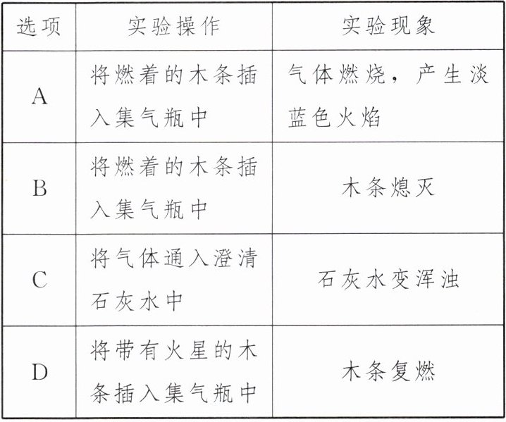 |A|将燃着的木条插入集气瓶中|气体燃烧,产生淡蓝色火焰|