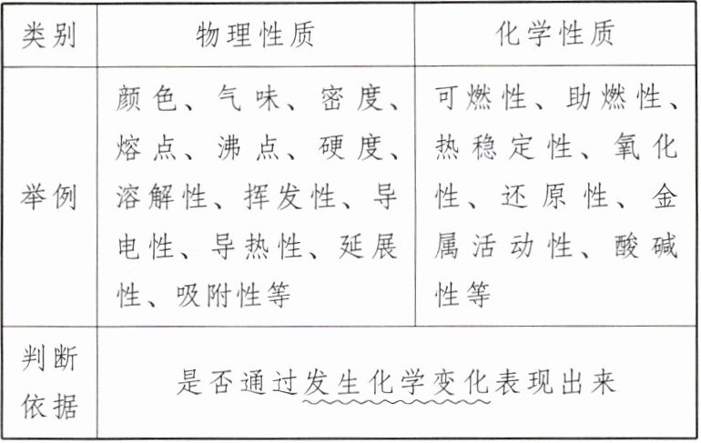|举例|颜色、气味、密度、熔点、沸点、硬度、溶解性、挥发性、导电性、导热性、延展性、吸附性等|可燃性、助燃性、热稳定性、氧化性、还原性、金属活动性、酸碱性等|