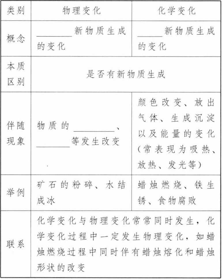 |伴随现象|物质的____、等发生改变|颜色改变、放出气体、生成沉淀以及能量的变化(常表现为吸热、放热、发光等)|