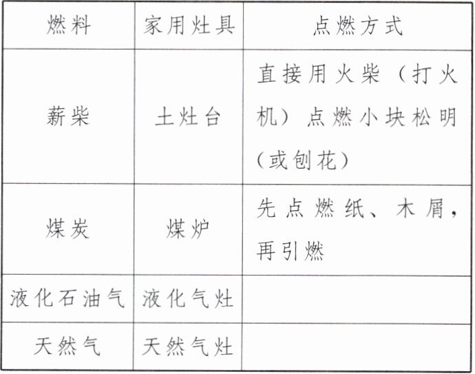 (2)不同种燃料对应的家用灶具及点燃方式如下表所示。