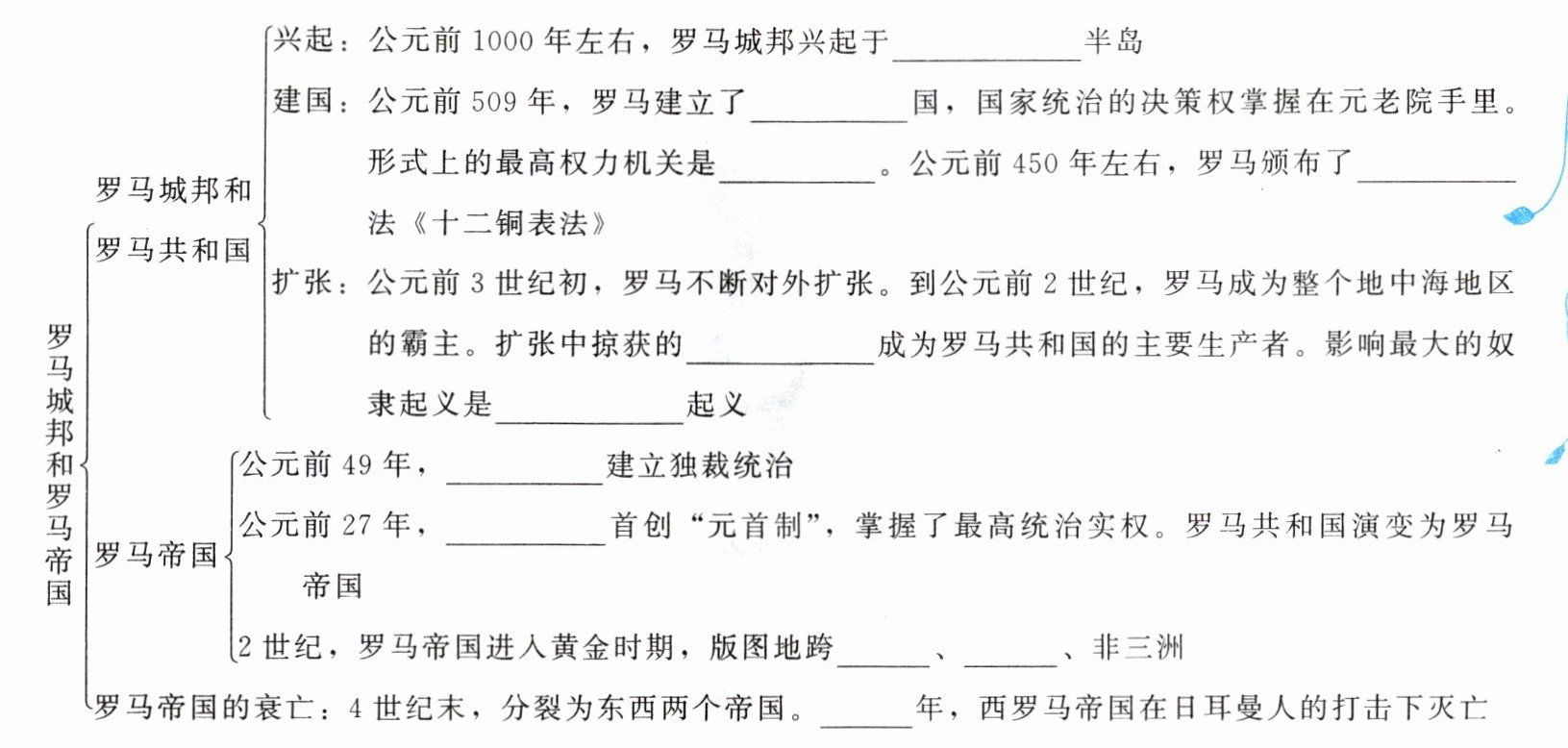 |罗马共和国建立|《 》颁布|罗马进入( )时期|罗马帝国分裂|( )帝国灭亡|