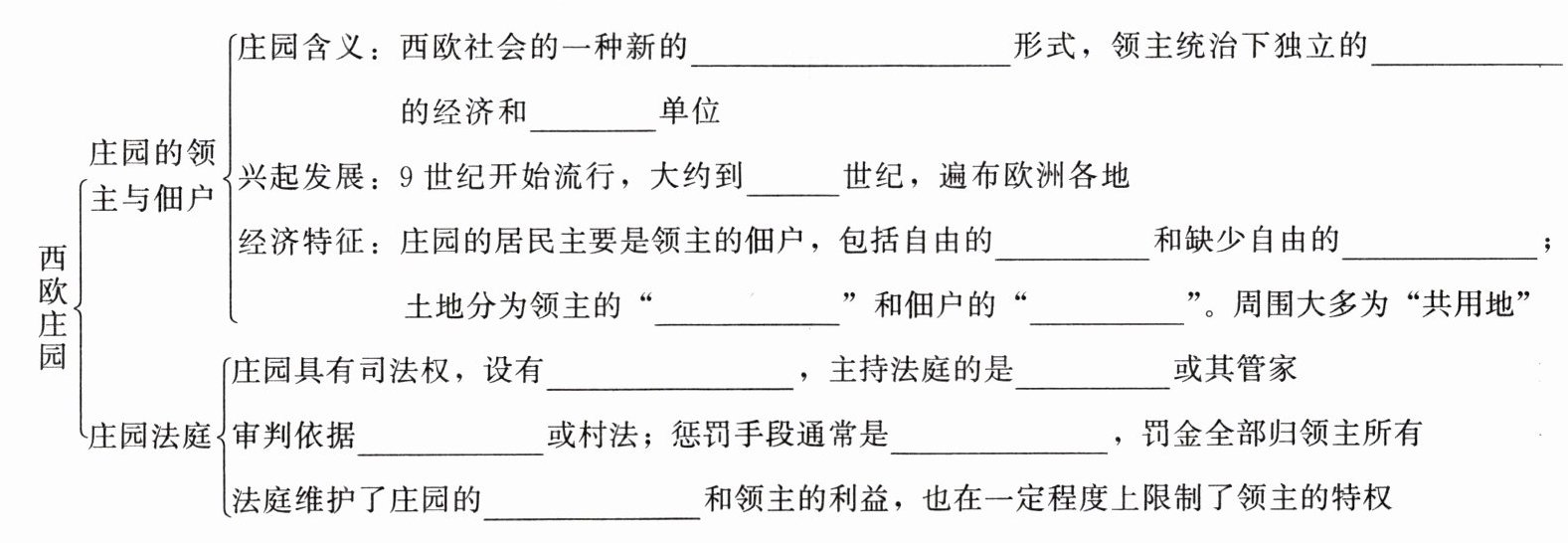 | | |经济特征:庄园的居民主要是领主的佃户,包括自由的______和缺少自由的______;土地分为领主的“______”和佃户的“______”。周围大多为“共用地”|