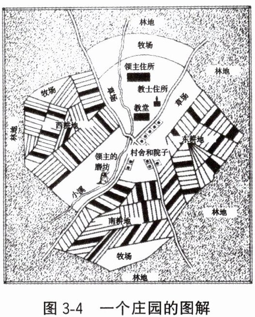 图 3 - 4 所示的是一个庄园的图解。庄园的面积大小不一,大多以村庄为基础,领主在庄园上一般建有住宅、教堂、磨坊、仓库、马厩等设施,置备犁、耙等农具,养有各种牲畜及家禽等。有的大庄园内还有一定数量的手工业者,如木匠、铁匠、首饰匠、皮革匠等,生产手工业品,供应领主及居民的需要。庄园的耕作制度有三种:条田制,即庄园的所有耕地都呈条田状,插花分布,领主自营地、各家各户的份地互相交错;轮作制,基本是三圃制或二圃制,所有的条田又都混杂连片;敞田制,即当每季作物收获后,各户须将自己的条田向公众敞开,作为公共牧场。
