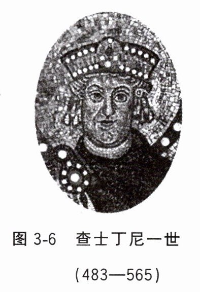 图 3 - 6 所示的是查士丁尼一世。查士丁尼 483 年生于托莱索的农民家庭,从小就表现出超人的精力和智慧。518 年,查士丁尼的叔父被拥立为皇帝,他开始协助叔父掌理政务,制定各项国内外的重要政策。527 年,查士丁尼继任为东罗马帝国皇帝,把重建罗马奴隶制帝国的统治当作终生奋斗的目标。为实现这一目标,他东征西伐,花了 20 年的时间使地中海再次成为罗马的内湖。在国内,查士丁尼鼓励发展工商业,着手大兴土木,建筑城堡、修道院和教堂,如君士坦丁堡著名的圣索菲亚大教堂。