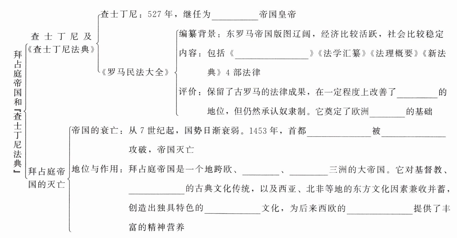 | |地位与作用:拜占庭帝国是一个地跨欧、 、 三洲的大帝国。它对基督教、 的古典文化传统,以及西亚、北非等地的东方文化因素兼收并蓄,创造出独具特色的 文化,为后来西欧的 提供了丰富的精神营养| |