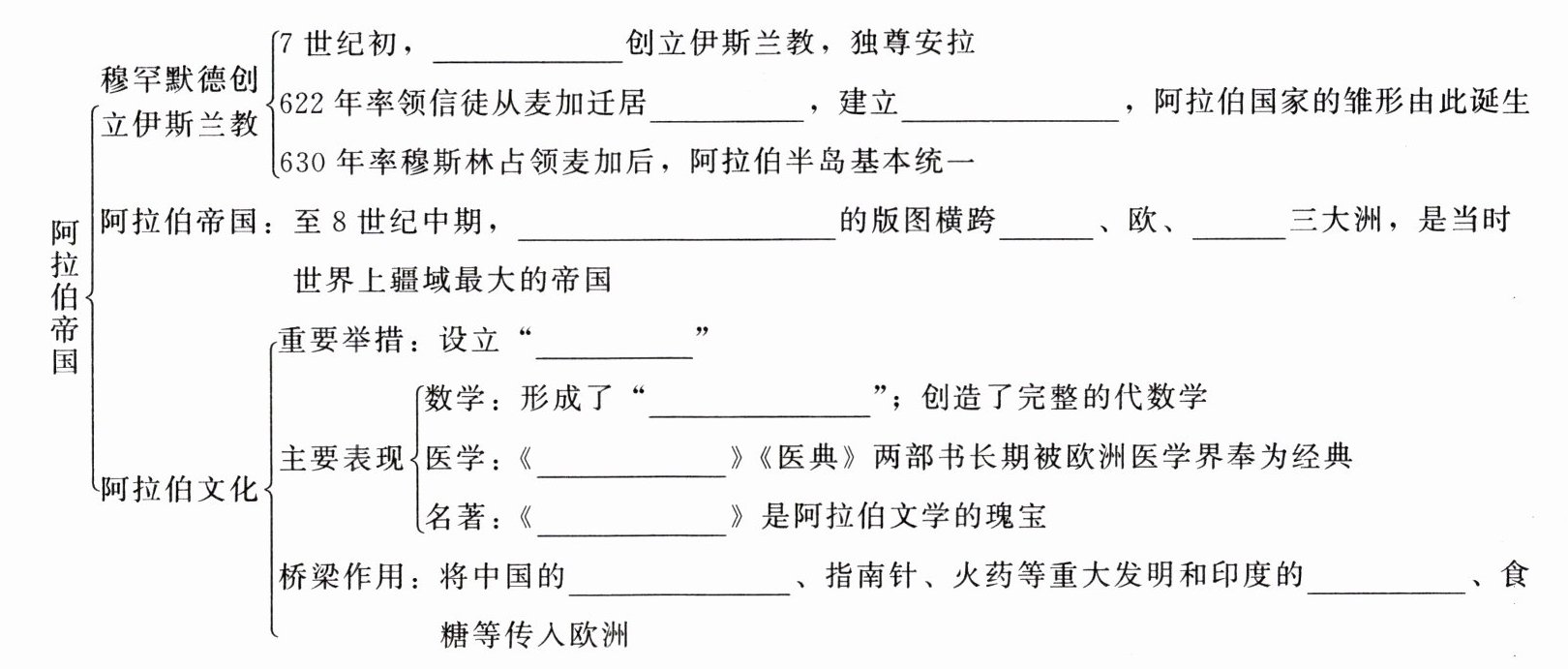 | 阿拉伯帝国 | 穆罕默德创立伊斯兰教 | 7 世纪初,____创立伊斯兰教,独尊安拉 |