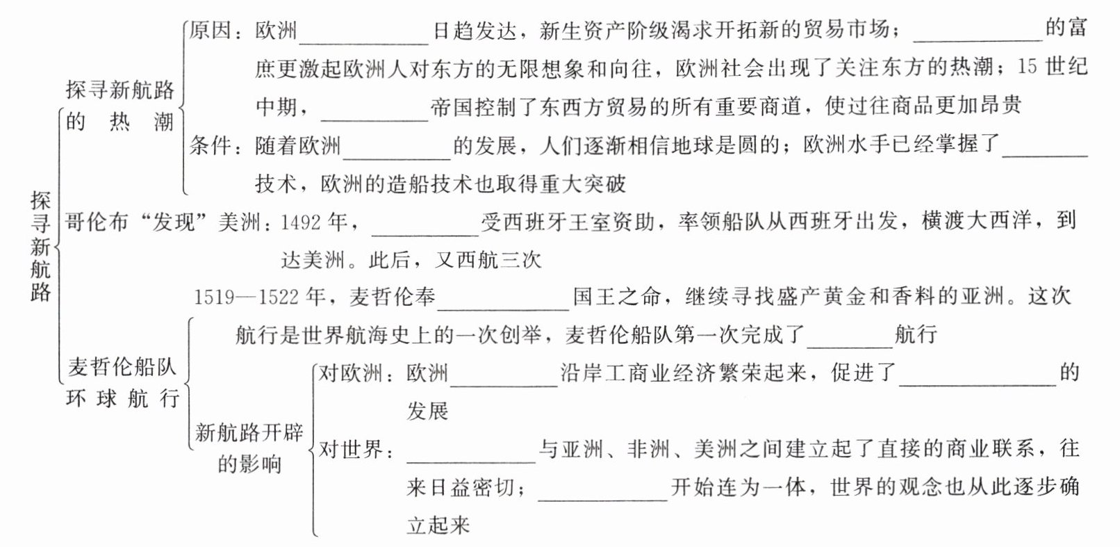 ||麦哲伦船队环球航行|1519—1522年,麦哲伦奉______国王之命,继续寻找盛产黄金和香料的亚洲。这次航行是世界航海史上的一次创举,麦哲伦船队第一次完成了______航行|