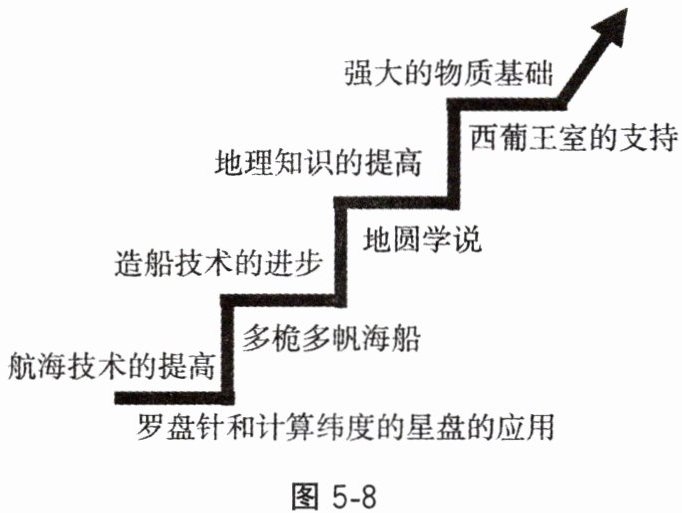 图5-7所示的是哥伦布登上美洲大陆。哥伦布(1452—1506)出身于意大利热那亚的一个织工家庭,早年在作坊里干过活,当过海员,随船队到过英国、冰岛等地。他对东方很向往。1484年,他请求葡萄牙国王约翰二世资助他的航行,遭到拒绝。两年后,他请求西班牙王室资助,但是直到1492年西班牙国王斐迪南和王后伊莎贝拉才采纳了他的计划。他从西班牙的帕洛斯出航后,10月到达巴哈马群岛中的一个小岛。登陆后,称它为圣萨尔瓦多岛,意为“救世主”,并宣布该岛归西班牙所有。