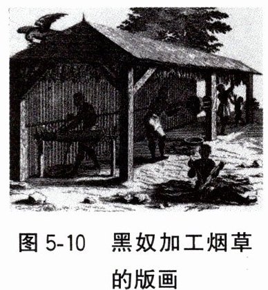 图5-10所示的是18世纪的一幅描绘黑奴加工烟草的版画。该图描绘了在西班牙殖民地圣多明各(位于今天的南美洲),黑奴正在加工烟草的场景。1492年10月12日,在哥伦布踏上美洲海岸第一天所记的航海日志里,写着几种当地人送来的礼物,其中就有“发出独特芬芳气味的黄色干叶”——烟草。烟草随着哥伦布船队的返航最先来到西班牙,不久后传到葡萄牙,紧接着又迅速传到欧洲其他地区。到了1620年时,烟草已经成为不折不扣的全球性作物。