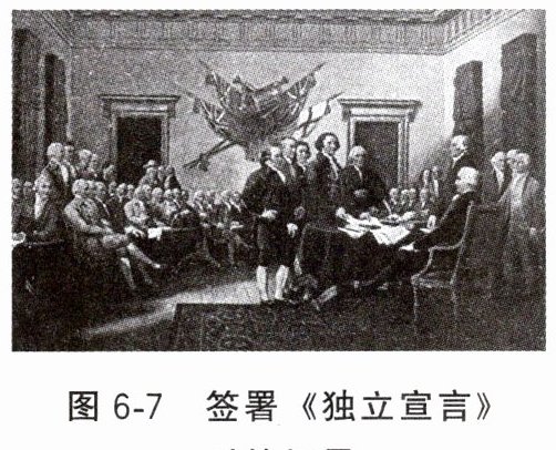 图 6 - 7 所示的是签署《独立宣言》时的场景。1776 年 7 月 4 日,在人民群众的强力推动下,第二届大陆会议通过由托马斯·杰斐逊起草的《独立宣言》。《独立宣言》的通过和发表,标志着美国的诞生,原来的英属北美 13 个殖民地,成为美国最早的 13 个州。图中签署《独立宣言》时的场面,取自约翰·特朗布尔的油画《独立宣言》。画面上居中的是宣言起草委员会的 5 个成员,从左至右分别是:约翰·亚当斯、罗杰·谢尔曼、罗伯特·利文斯顿、托马斯·杰斐逊、本杰明·富兰克林。作者在画中根据他们的贡献分别加以安排,其中杰斐逊显得特别有力量。