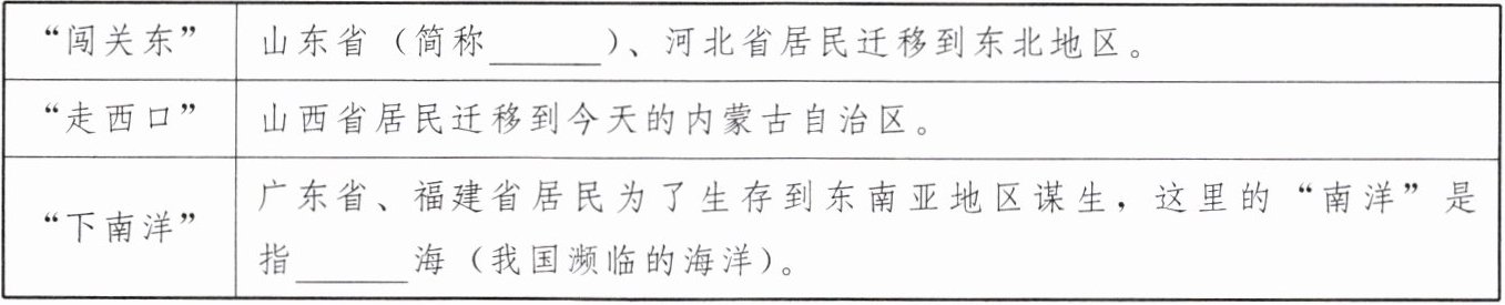 |“闯关东”|山东省(简称____)、河北省居民迁移到东北地区。|