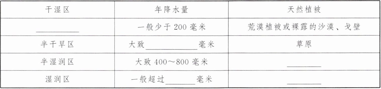 2. 干湿区:我国划分出湿润、半湿润、半干旱、干旱四类地区。通常,年降水量大于蒸发量的地区为____;年降水量小于蒸发量的地区为____。四类干湿区对比如下。