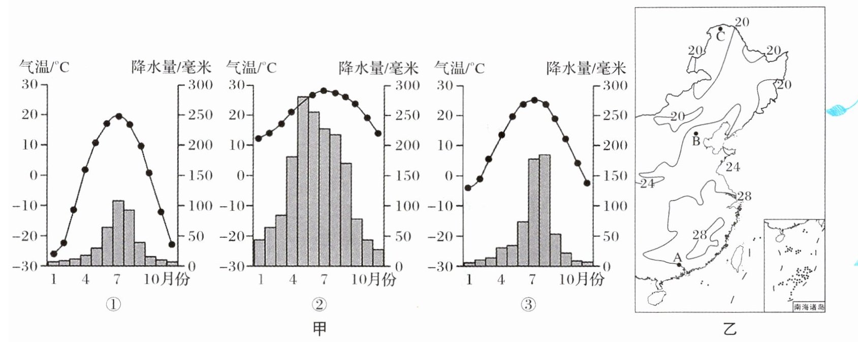 甲图示意中国部分城市多年平均各月气温和降水量,乙图示意中国局部地区某月平均气温分布,读图完成7~9题。