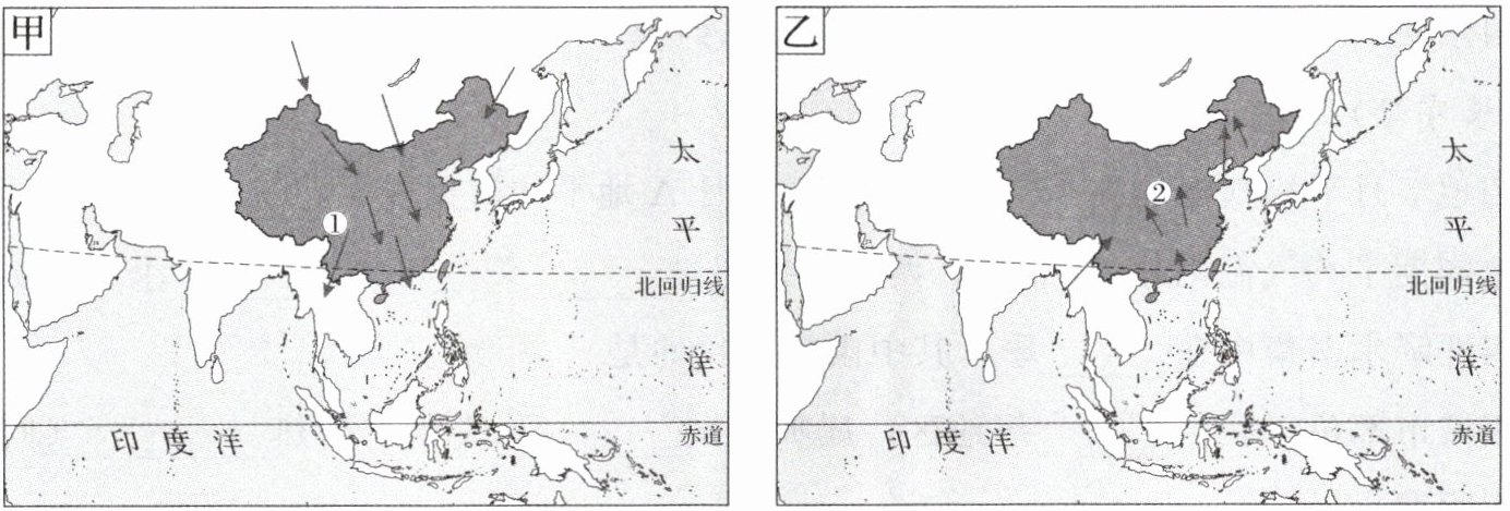 (2)乙图所示季风的性质是____(温暖湿润/寒冷干燥),箭头②表示____(风向)季风,来自____(海洋)。