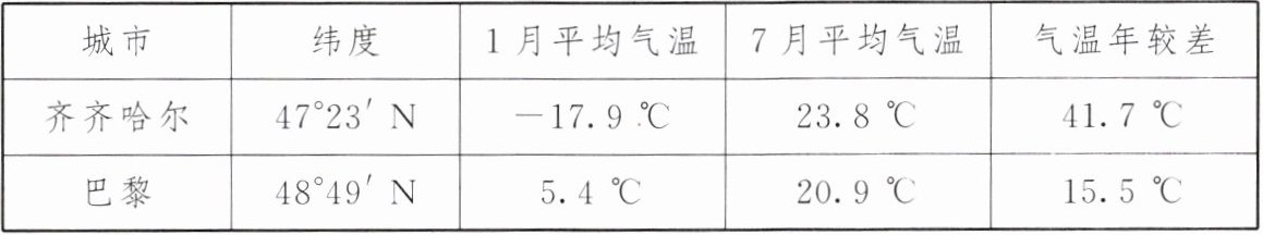 3. 读表可知,我国的齐齐哈尔和法国的巴黎纬度相近,但是齐齐哈尔冬季气温明显偏低、夏季气温明显偏高,说明我国气候具有显著的____特征,该特征在我国表现最典型的气候类型A是____气候。