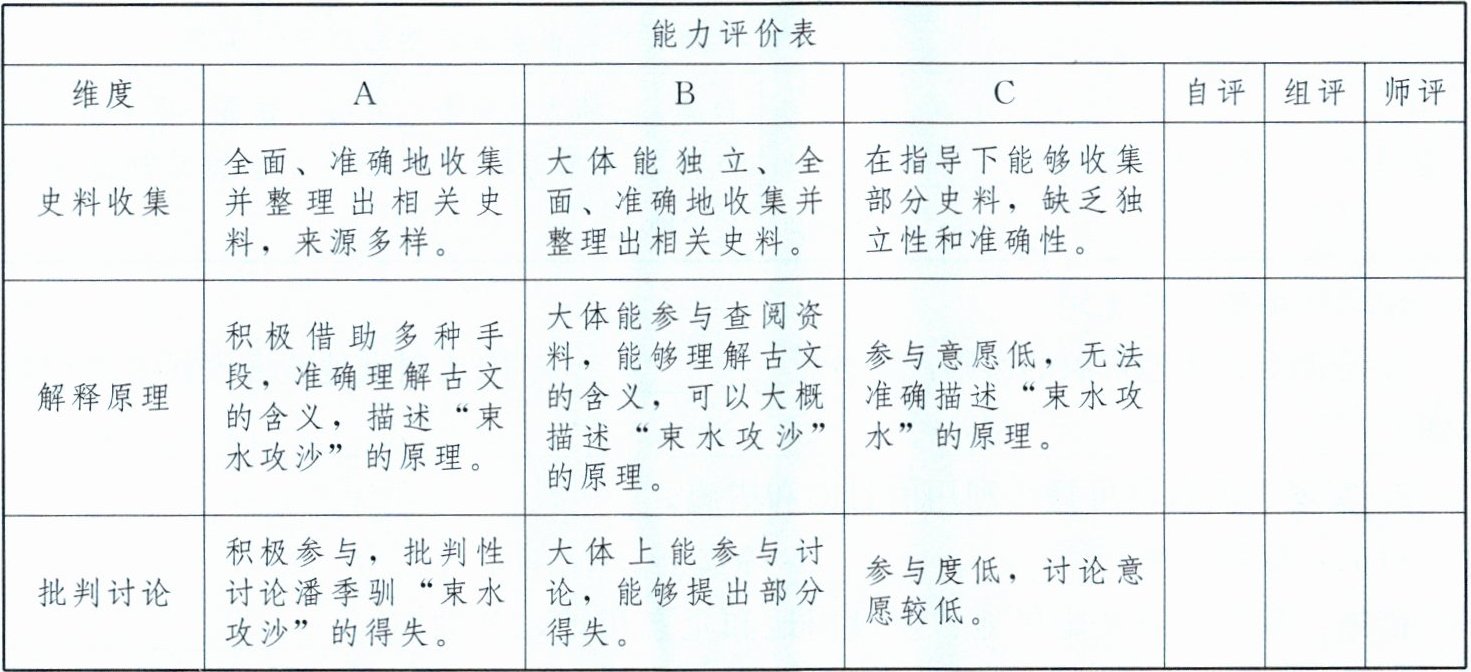 | 批判讨论 | 积极参与,批判性讨论潘季驯“束水攻沙”的得失。 | 大体上能参与讨论,能够提出部分得失。 | 参与度低,讨论意愿较低。 | | | |