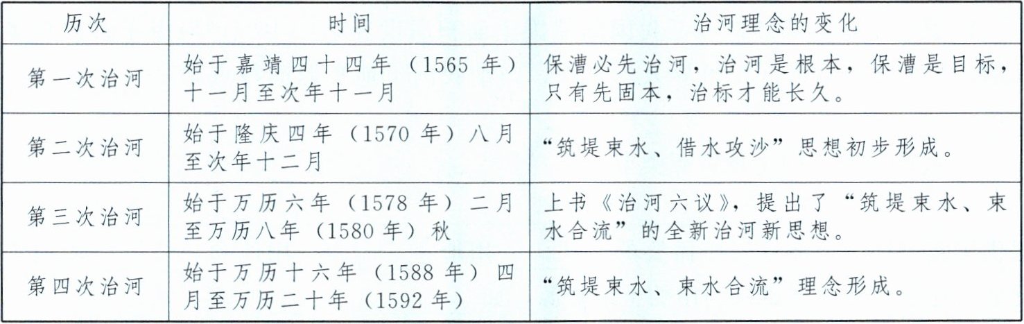 | 第四次治河 | 始于万历十六年(1588年)四月至万历二十年(1592年) | “筑堤束水、束水合流”理念形成。 |