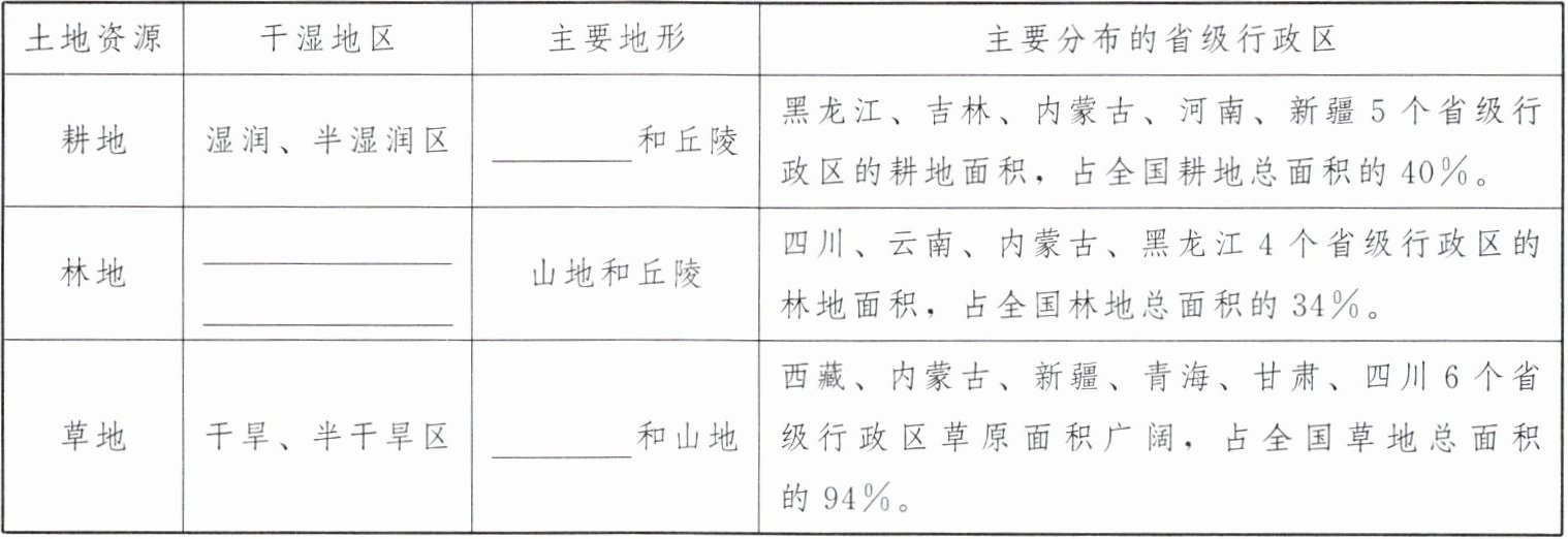 1. 三 总量丰富 人均不足 2. 林地 草地 耕地 水域及水利设施用地 城镇村及工矿用地 湿地 园地 交通运输用地 农业 建设 生态 沙漠 戈壁 3. 紧缺 少 低 大