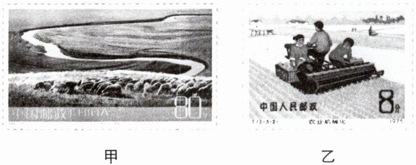 下图为某同学收集的两枚体现我国不同土地利用类型的邮票,读图完成2~3题。