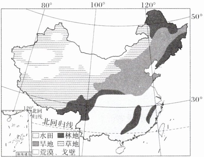 “全方位夯实粮食安全根基……牢牢守住十八亿亩耕地红线,逐步把永久基本农田全部建成高标准农田。”右图示意中国主要土地利用类型分布,读图完成6~8题。