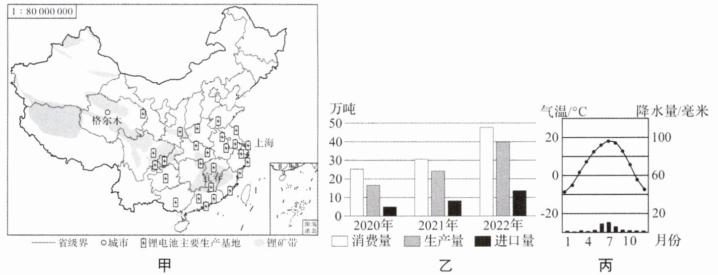 9. 锂电池产业属于高新技术产业,其主要成分锂被誉为“白色石油”。甲图示意我国锂矿与锂电池主要生产基地分布,乙图示意2020—2022年我国主要锂矿资源的消费量、生产量与进口量,丙图示意格尔木多年平均各月气温和降水量。读图完成下列问题。