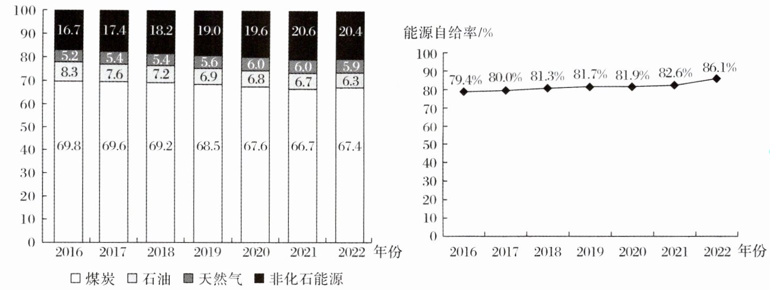 【例题】自《能源发展“十三五”规划》将清洁低碳能源作为能源供应增量的主体以来,我国能源生产结构不断变化,能源自给率(能源生产量与消费量的比值)持续增加。下图示意2016—2022年我国能源生产结构及自给率统计情况,读图完成下列问题。