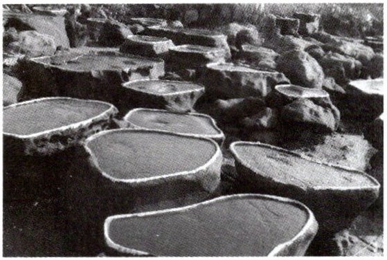 古代沿海地区常选择低平的淤泥质海滩开挖盐田制盐,但海南省洋浦却是利用晒盐槽制盐。洋浦遍布火山岩,当地居民自宋朝起便将火山岩凿成砚式平台,面积1~2平方米不等,平台边缘留出1~2厘米的槽沿。在强烈的阳光照射下,装入晒盐槽的海水会自然蒸发结晶成盐。右下图示意洋浦晒盐槽景观,读图完成1~2题。
