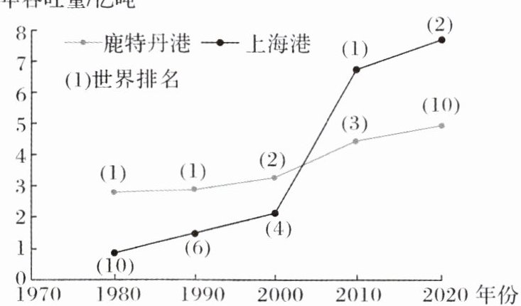 港口吞吐量的世界排名是反映港口国际地位的一个重要指标,上海港是我国第一个进入世界年吞吐量排名前十的港口。下图示意上海港与鹿特丹港货物年吞吐量及其世界排名的变化,读图完成3~4题。
