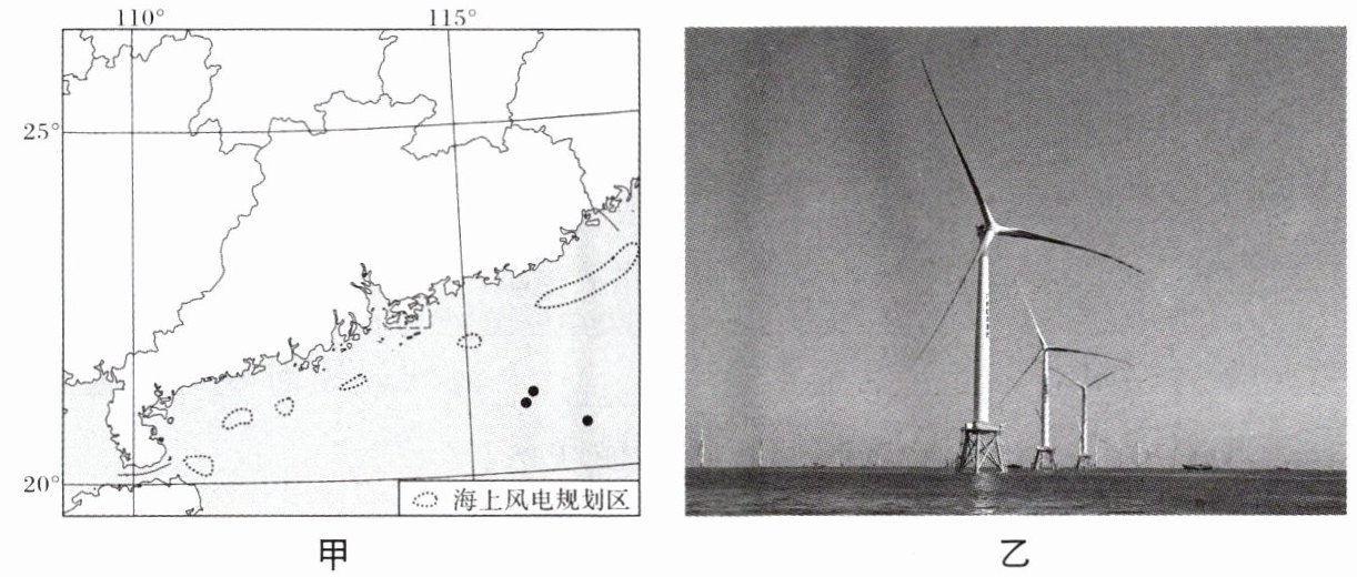 近年来,广东省充分利用自身优势大力发展海上风电,其中阳西县建成了我国首个“海上风电+海洋牧场”示范区,并于2022年初完成首次收鱼,引领我国“海上发电、海下养鱼”立体利用模式的发展。甲图示意广东省风电场规划,乙图示意海上发电、海下养鱼景观,读图完成7~8题。