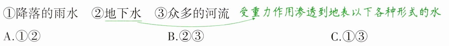①降落的雨水 ②地下水 ③众多的河流 受重力作用渗透到地表以下各种形式的水
