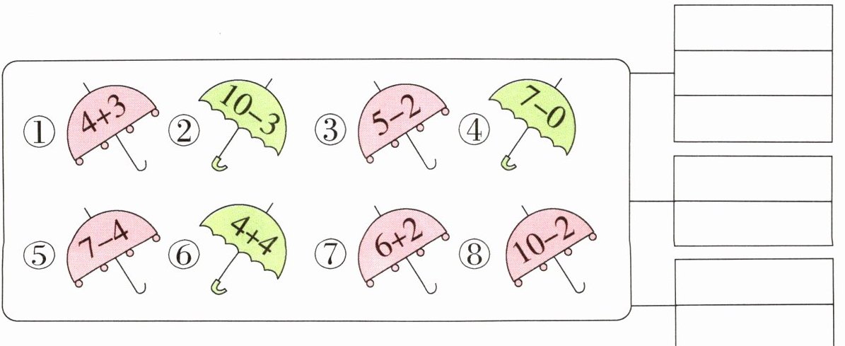 提示:可以从不同角度进行分类,比如按照算式的结果,分法一:按计算结果分类:计算①4+3=7,②10-3=7,④7-0=7,这三个算式的结果都是7,所以归为一类。计算③5-2=3,⑤7-4=3,这两个算式的结果都是3,所以归为一类。计算⑥4+4=8,⑦6+2=8,⑧10-2=8,这三个算式的结果都是8,所以归为一类。因此,分法一是①②④;③⑤;⑥⑦⑧。分法二:按运算类型分类:①4+3,⑥4+4,⑦6+2,这些算式都是加法,归为一类。②10-3,③5-2,④7-0,⑤7-4,⑧10-2,这些算式全是减法,归为一类。因此,分法二是①⑥⑦;②③④⑤⑧。分法三:按照伞的颜色分类:①③⑤⑦⑧伞的颜色是红色,将这些归为一类;②④⑥伞的颜色是绿色,将这些归为一类。因此,分法三是①③⑤⑦⑧;②④⑥。