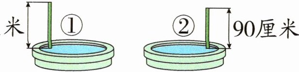 5.② 10 提示:因为两根竹竿同样长,①号水池竹竿露出水面1米,②号水池竹竿露出水面90厘米。1米=100厘米,100厘米>90厘米,露出水面部分越短,水越深,所以②号水池里的水深一些。①号水池竹竿露出水面100厘米,②号水池竹竿露出水面90厘米,那么深度差为100−90=10(厘米)。