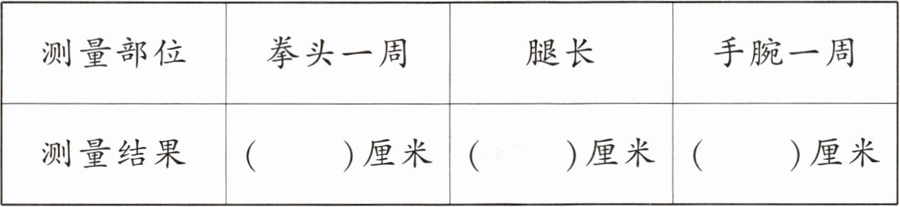 |测量结果|( )厘米|( )厘米|( )厘米|