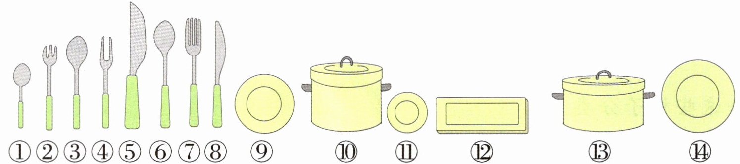 勺子:①③⑥ 刀:⑤⑧ 叉:②④⑦ 盘:⑨⑪⑫⑭ 锅:⑩⑬