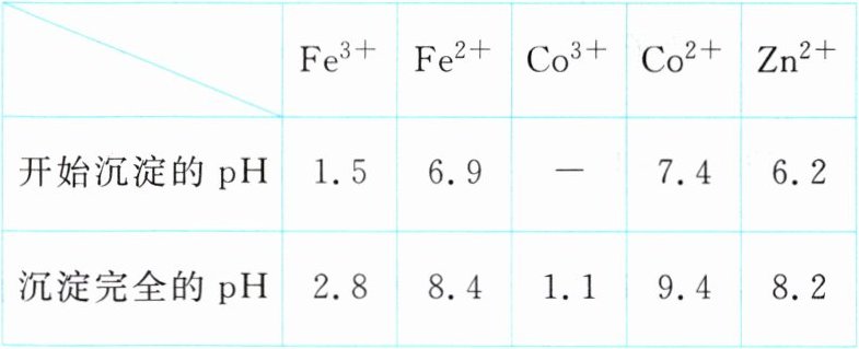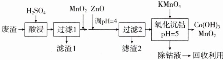(4)最终得到的“除钴液”中含有的金属离子主要是最初“酸浸”时得到的Zn²⁺和调pH时引入的Zn²⁺、加入KMnO₄“氧化沉钴”时引入的K⁺,而阴离子是在“酸浸”时引入的SO₄²⁻,因此其中主要的盐有ZnSO₄和K₂SO₄。当溶液pH = 1.1时,c(H⁺) = 10⁻¹.¹mol·L⁻¹,Co³⁺恰好完全沉淀,此时溶液中c(Co³⁺) = 1.0×10⁻⁵mol·L⁻¹,则c(OH⁻) = $\frac{K_w}{c(H^+)}$ = 10⁻¹².⁹mol·L⁻¹,则Ksp[Co(OH)₃] = 1.0×10⁻⁵×(10⁻¹².⁹)³ = 10⁻⁴³.⁷。“除钴液”的pH = 5,即c(H⁺) = 10⁻⁵mol·L⁻¹,则c(OH⁻) = $\frac{K_w}{c(H^+)}$ = 10⁻⁹mol·L⁻¹,此时溶液中c(Co²⁺) = $\frac{K_{sp}[Co(OH)_3]}{c^3(OH^-)}$ = $\frac{10^{-43.7}}{(10^{-9})^3}$mol·L⁻¹ = 10⁻¹⁶.⁷mol·L⁻¹。
