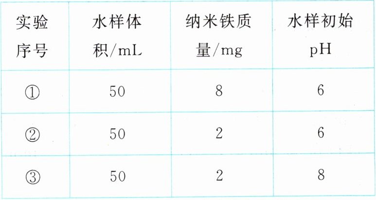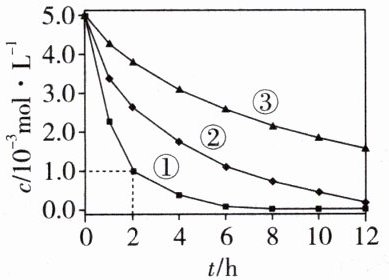 2.C [实验①中,0~2小时内平均反应速率$v(\mathrm{SeO_{3}^{2-}})=\frac{(5.0×10^{-3}-1.0×10^{-3})\mathrm{mol· L^{-1}}}{2\mathrm{h}}=2.0×10^{-3}\mathrm{mol· L^{-1}· h^{-1}}$,A不正确;实验③中水样初始$\mathrm{pH}=8$,溶液显弱碱性,发生反应的离子方程式中不能出现$\mathrm{H^{+}}$,B不正确;综合分析实验①和②可知,在相同时间内,实验①中$\mathrm{SeO_{3}^{2-}}$浓度的变化量大,因此,其他条件相同时,适当增加纳米铁质量可加快反应速率,C正确;综合分析实验②和③可知,在相同时间内,实验②中$\mathrm{SeO_{3}^{2-}}$浓度的变化量大,因此,其他条件相同时,适当减小初始$\mathrm{pH}$,$\mathrm{SeO_{3}^{2-}}$的去除效果更好,但是当初始$\mathrm{pH}$太小时,$\mathrm{H^{+}}$浓度太大,纳米铁与$\mathrm{H^{+}}$反应速率加快,会导致与$\mathrm{SeO_{3}^{2-}}$反应的纳米铁减少,因此,当初始$\mathrm{pH}$越小时,$\mathrm{SeO_{3}^{2-}}$的去除效果不一定越好,D不正确。]