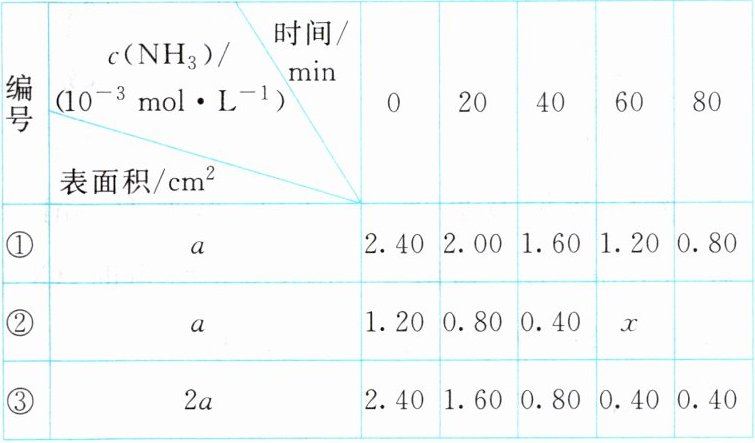 3. (2022·浙江6月选考)恒温恒容的密闭容器中,在某催化剂表面上发生氨的分解反应:$2NH_{3}(g)\xrightarrow{催化剂}N_{2}(g) + 3H_{2}(g)$,测得不同起始浓度和催化剂表面积下氨浓度随时间的变化如下表所示,下列说法不正确的是(