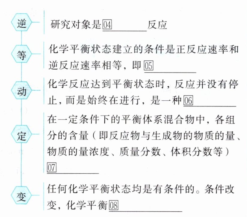 2. 01相等 02保持不变 03组成 04可逆 05$v_{正}=v_{逆}\neq0$ 06动态平衡 07保持一定 08可能发生改变