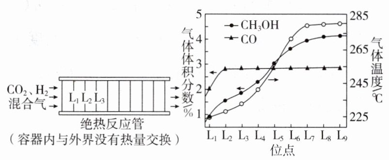 $225\ ^{\circ}C$、$8× 10^{6}\ Pa$下,将一定比例$CO_{2}$、$H_{2}$混合气匀速通过装有催化剂的绝热反应管。装置及$L_{1}$、$L_{2}$、$L_{3}·s$位点处(相邻位点距离相同)的气体温度、$CO$和$CH_{3}OH$的体积分数如图所示。