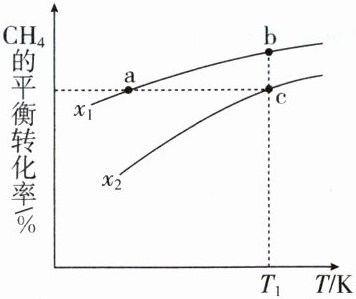 5.B [一定条件下,增大$H_2O(g)$的浓度,能提高$CH_4$的转化率,即$x$值越小,$CH_4$的转化率越大,则$x_1<x_2$,A正确;b点和c点温度相同,$CH_4$的起始物质的量都为$1\ mol$,b点$x$值小于c点,则b点加$H_2O(g)$多,反应物浓度大,则反应速率:$v_{b正}>v_{c正}$,B错误;由图像可知,$x$一定时,温度升高$CH_4$的平衡转化率增大,说明正反应为吸热反应,温度升高平衡正向移动,$K$增大;温度相同,$K$不变,则点a、b、c对应的平衡常数:$K_a<K_b=K_c$,C正确;该反应为气体分子数增大的反应,反应进行时压强发生改变,所以温度一定时,当容器内压强不变时,反应达到平衡状态,D正确。]