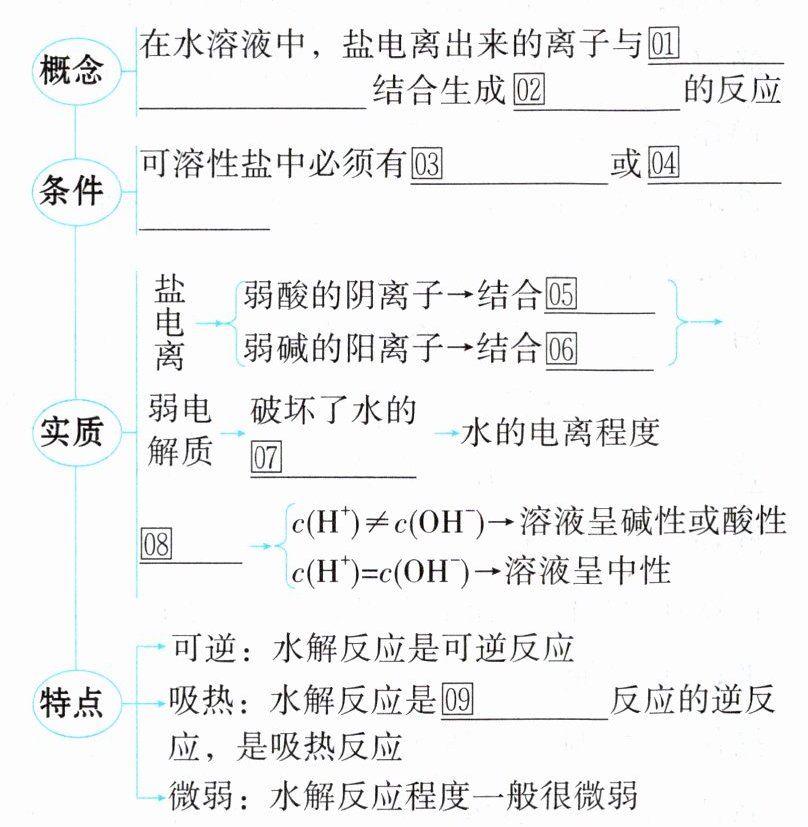 1.①水电离出来的$H^{+}$或$OH^{-}$ ②弱电解质 ③弱酸根离子 ④弱碱阳离子 ⑤$H^{+}$ ⑥$OH^{-}$ ⑦电离平衡 ⑧增大 ⑨酸碱中和