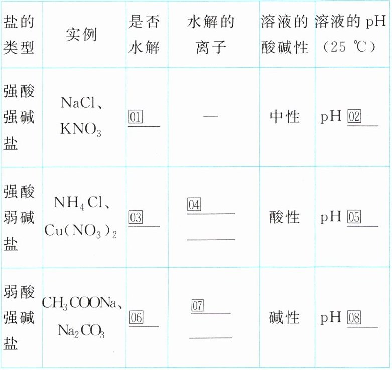 2. 盐类水解的规律 ①否 ②= ③是 ④$NH_{4}^{+}$、$Cu^{2+}$ ⑤<7 ⑥是 ⑦$CH_{3}COO^{-}$、$CO_{3}^{2-}$ ⑧>7