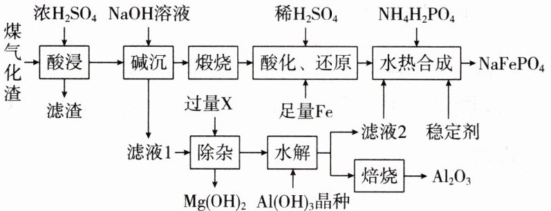 $煤气化渣\xrightarrow[酸浸]{浓H_{2}SO_{4}}滤渣\xrightarrow[碱沉]{NaOH溶液} \xrightarrow[煅烧]{}过量X\xrightarrow[酸化、还原]{稀H_{2}SO_{4}、足量Fe} \xrightarrow[水热合成]{NH_{4}H_{2}PO_{4}、稳定剂}NaFePO_{4}$