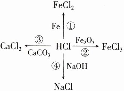 $FeCl₂\xleftarrow[①]{Fe}HCl\xrightarrow[②]{Fe₂O₃}FeCl₃\xleftarrow[③]{CaCl₂}CaCO₃\xrightarrow[④]{NaOH}NaCl$