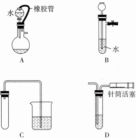 3.A [B项利用液差法:夹紧弹簧夹,从长颈漏斗中向试管内加水,长颈漏斗中会形成一段液柱,停止加水后,通过液柱是否变化即可检查;C项利用加热法:用酒精灯微热(或用手捂热)试管,通过观察烧杯中有无气泡以及停止微热后导管中水柱是否变化即可检查;D项利用抽气法:向外轻轻拉动注射器的活塞,通过观察浸没在水中的玻璃导管口是否有气泡冒出即可检查。]