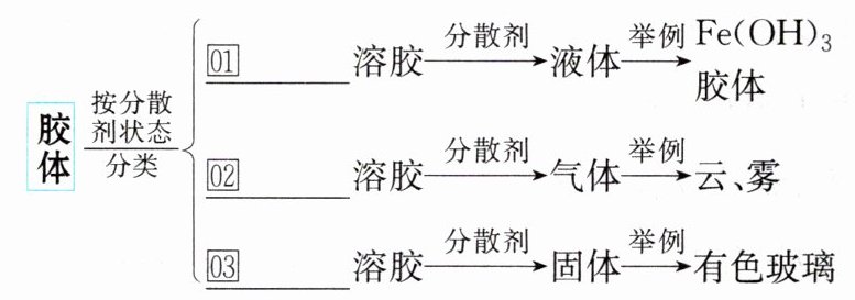 2.①液 ②气 ③固 ④胶体 ⑤溶液 ⑥FeCl₃ + 3H₂O △ Fe(OH)₃(胶体)+ 3HCl