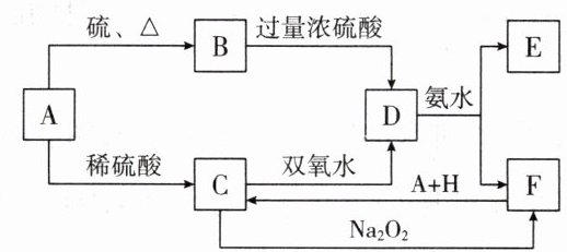 4.C [F为红褐色沉淀,且由氨水与D反应得到,则F为氢氧化铁,D为铁盐,C与双氧水反应生成铁盐,则C为亚铁盐,A与稀硫酸反应生成C,则C为硫酸亚铁,A为铁单质,B为硫化亚铁,D为硫酸铁,E为硫酸铵,H为硫酸。鉴定铵根离子所用的试剂为浓NaOH溶液、湿润的红色石蕊试纸,C错误。]