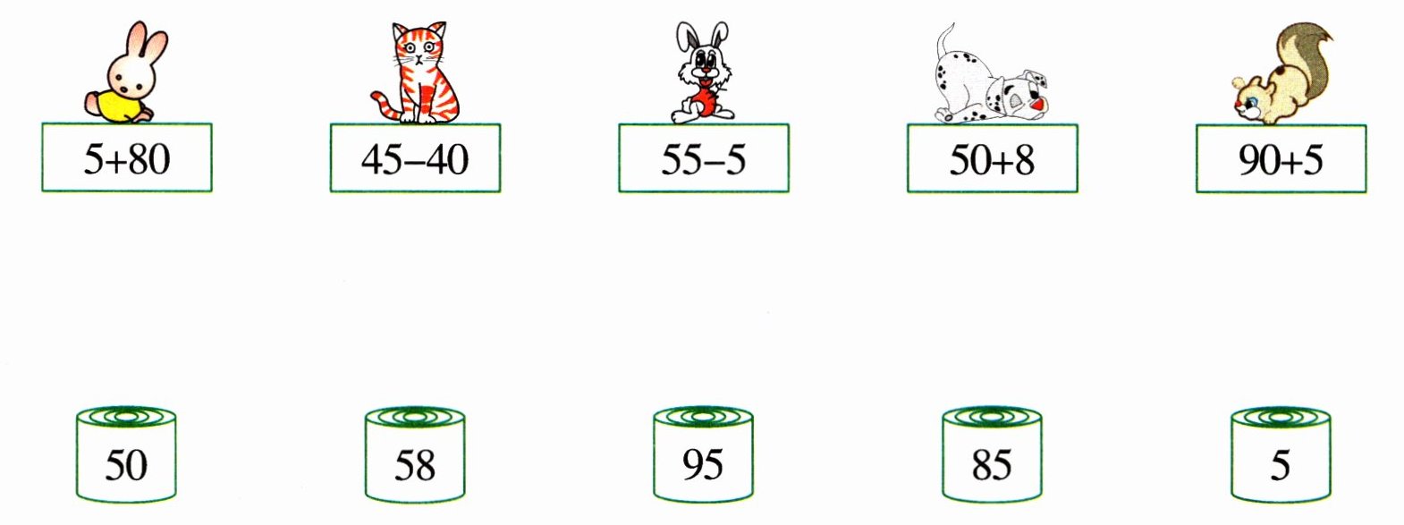 【答案】:$5 + 80$连$85$;$45 - 40$连$5$;$55 - 5$连$50$;$50 + 8$连$58$;$90 + 5$连$95$。