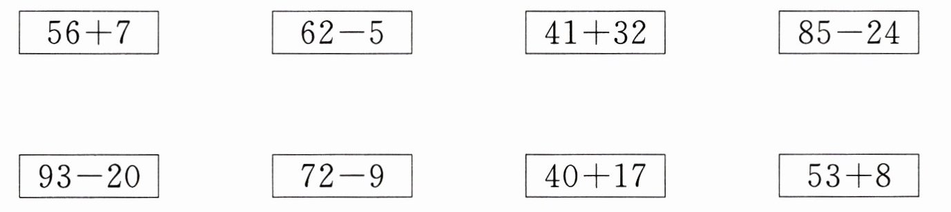 【答案】:$56 + 7$连$72 - 9$;$62 - 5$连$40 + 17$;$41 + 32$连$93 - 20$;$85 - 24$连$53 + 8$。