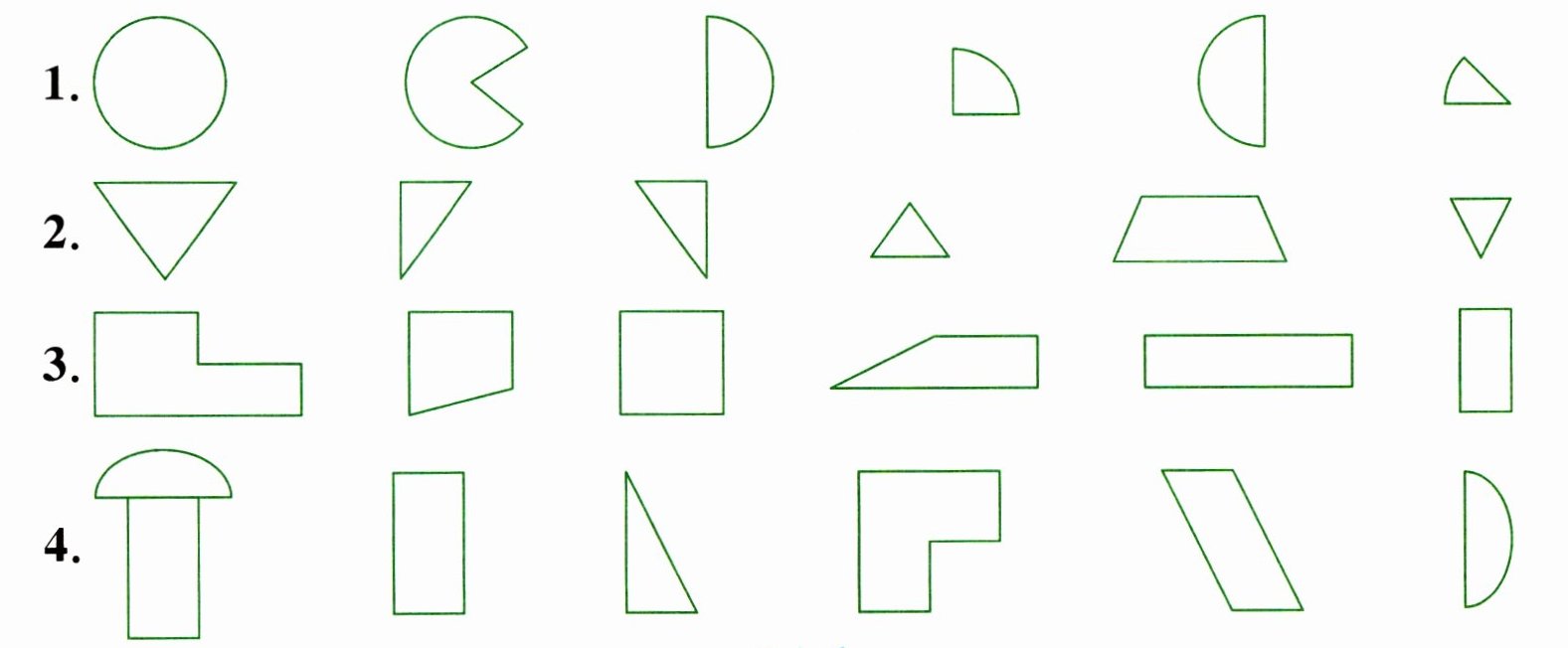 五 从右边 5 个图形中选出 2 个拼成左边的图形,请圈出来。
